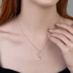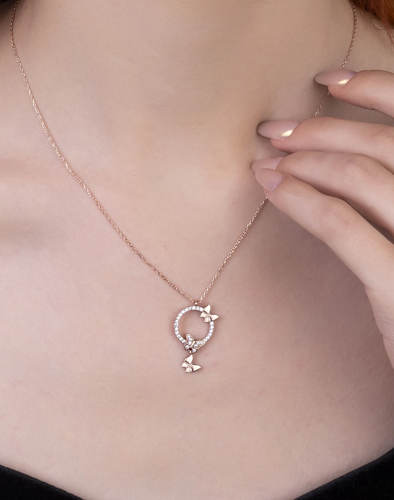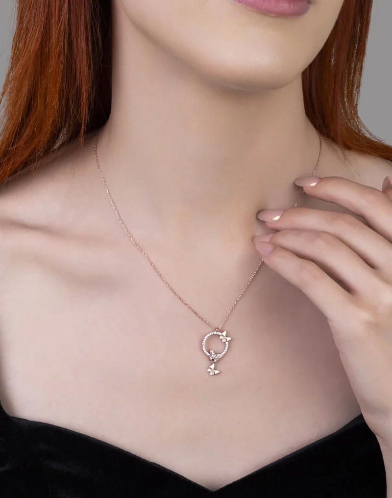 Her bir detayı özenle işlenmiş olan bu kolye, sallantılı tasarımıyla her anında zarafeti ve ışıltıyı bir araya getiriyor. Kelebeklerin romantik dansı, aşkın hafifliğini ve özgür ruhunu mükemmel bir şekilde yansıtıyor. Rose altın kaplama, kolyenin üzerindeki detayları vurgulayarak modern ve şık bir görünüm kazandırıyor.