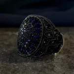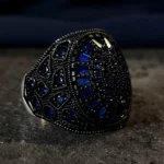 Tasarımda kullanılan ve kararlılığı simgeleyen geometrik motifler, sürekliliği ve içsel gücü temsil ederken aynı zamanda modern mimariden ilham alan köşeli bir estetik sunar. Parlak gümüşün doğal ışıltısı ile safir renginin asil tonları arasındaki kontrast, tasarıma maskülen bir enerji ve meydan okuyan bir karakter kazandırır. Bu yüzük, sadece görsel bir aksesuar değil, aynı zamanda takan kişinin cesaretini ve özgün stilini yansıtan sessiz bir imza öğesidir. Gösterişten uzak ama iddiasını her detayda hissettiren yapısıyla, güçlü ama rafine bir ifade sunar.