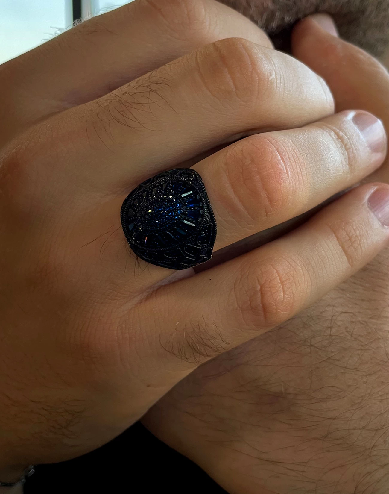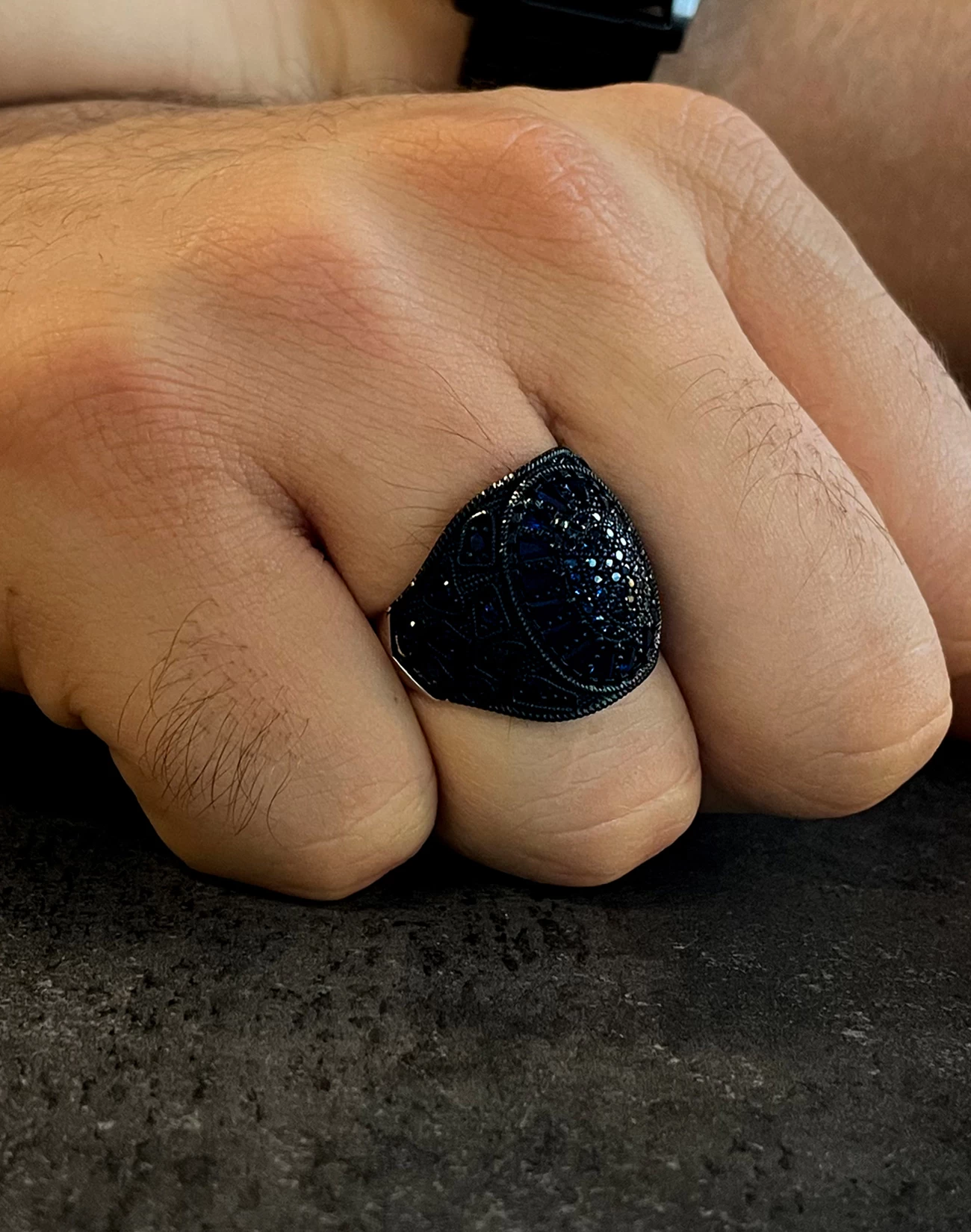 Modern çizgilerle şekillenen bu özel tasarım, klasik erkek takısı anlayışına sarsılmaz bir irade ve seçkin bir yorum kazandırır. 925 ayar gümüşten üretilen Cesaret Sembolü Özel Tasarım Erkek Yüzüğü BERIA, net hatları ve vakur formuyla güçlü bir duruş sergilerken, safir laciverti taşlarının büyüleyici ışıltısıyla sofistike bir şıklık sunar. Yüzüğün merkezinde yer alan derin lacivert yüzey, çevresini saran mikro işlemeli dokularla birlikte etkileyici ve korkusuz bir görünüm oluşturur.