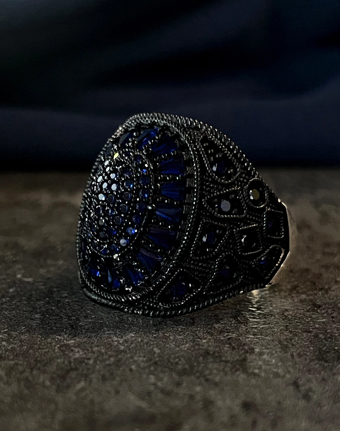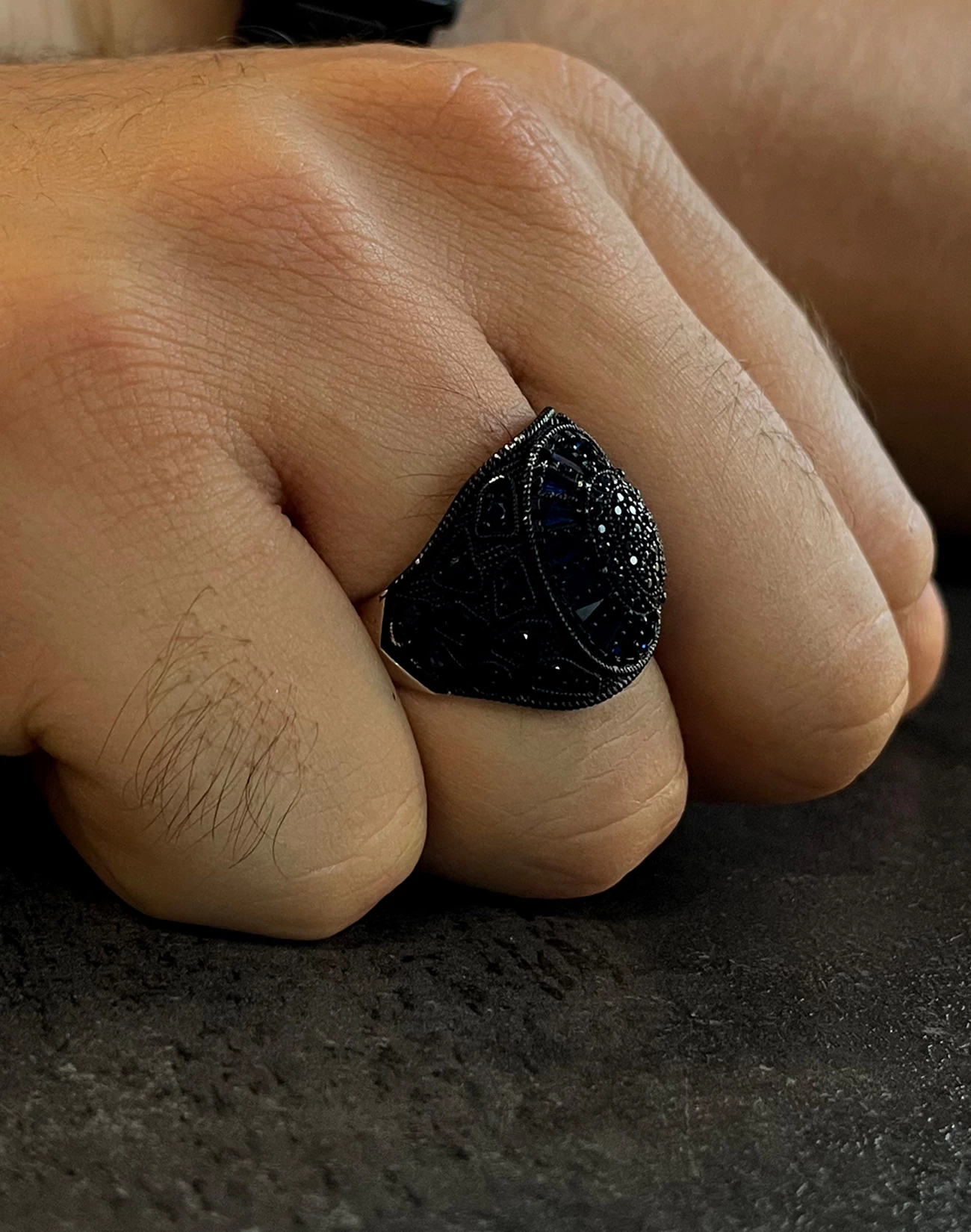 Tasarımda kullanılan ve kararlılığı simgeleyen geometrik motifler, sürekliliği ve içsel gücü temsil ederken aynı zamanda modern mimariden ilham alan köşeli bir estetik sunar. Parlak gümüşün doğal ışıltısı ile safir renginin asil tonları arasındaki kontrast, tasarıma maskülen bir enerji ve meydan okuyan bir karakter kazandırır. Bu yüzük, sadece görsel bir aksesuar değil, aynı zamanda takan kişinin cesaretini ve özgün stilini yansıtan sessiz bir imza öğesidir. Gösterişten uzak ama iddiasını her detayda hissettiren yapısıyla, güçlü ama rafine bir ifade sunar.