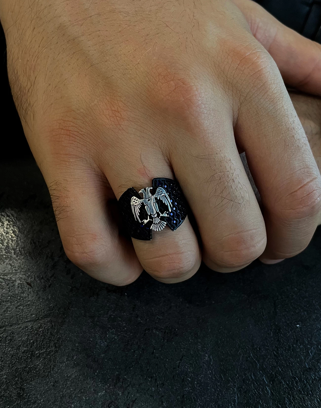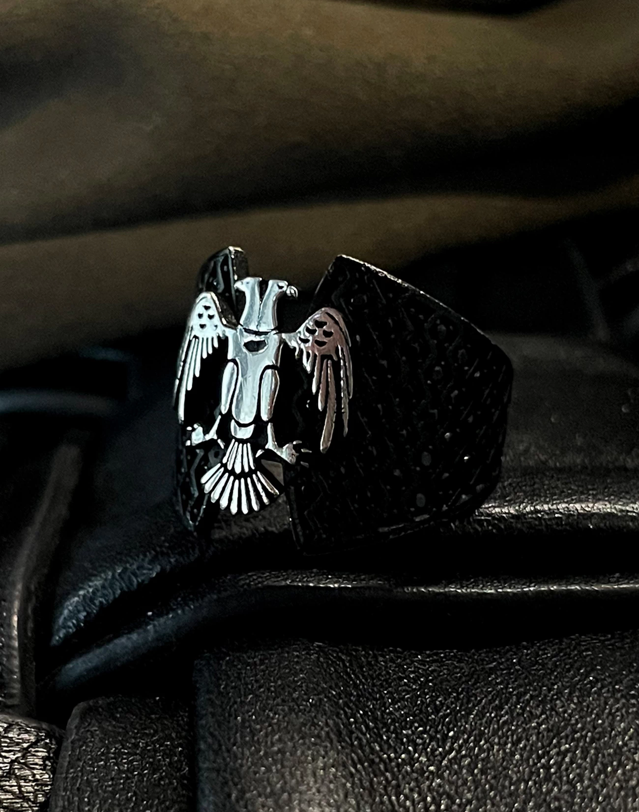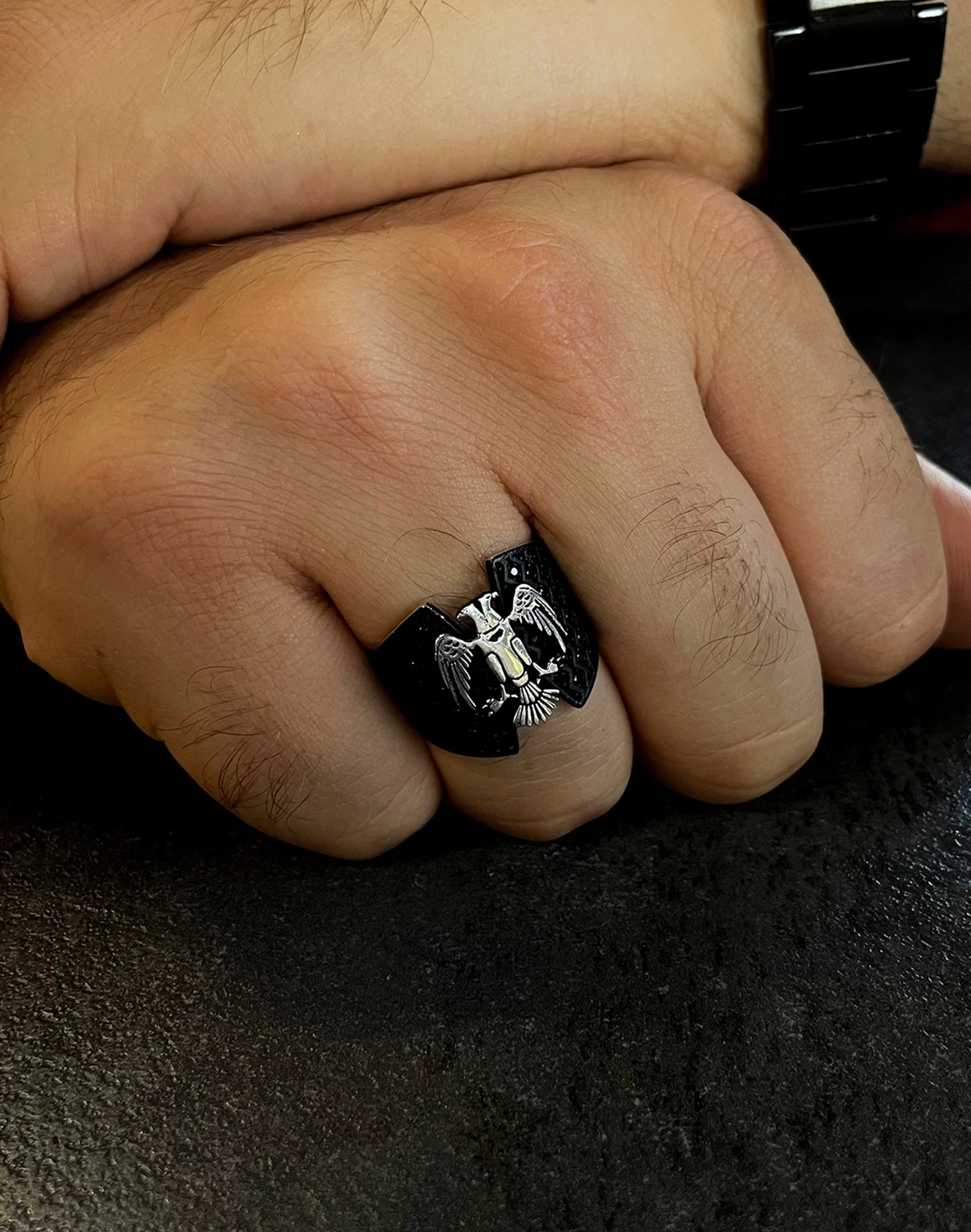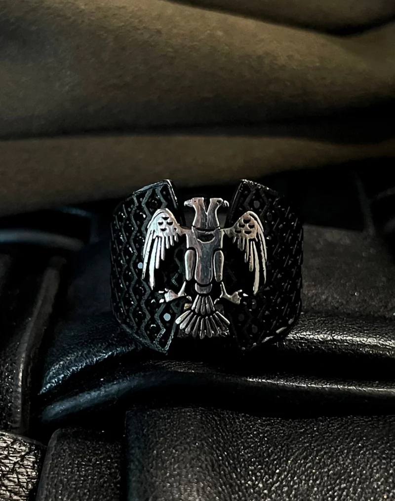 Çift başlı kartalın iki yöne bakan bakışları, hem geçmişi hem geleceği temsil eder. Bu anlam, yüzüğe yalnızca görsel bir çekicilik değil, derin bir sembolik değer kazandırır. Kartalın kanatlarında işlenen detaylar, ustalığın ve emeğin izlerini taşırken, siyah zemin üzerindeki kontrastlı gümüş figür, güçlü bir görsel etki oluşturur. Sert hatlarıyla net bir duruş sergilerken, ince işçiliğiyle sofistike bir şıklık sunar.