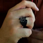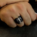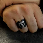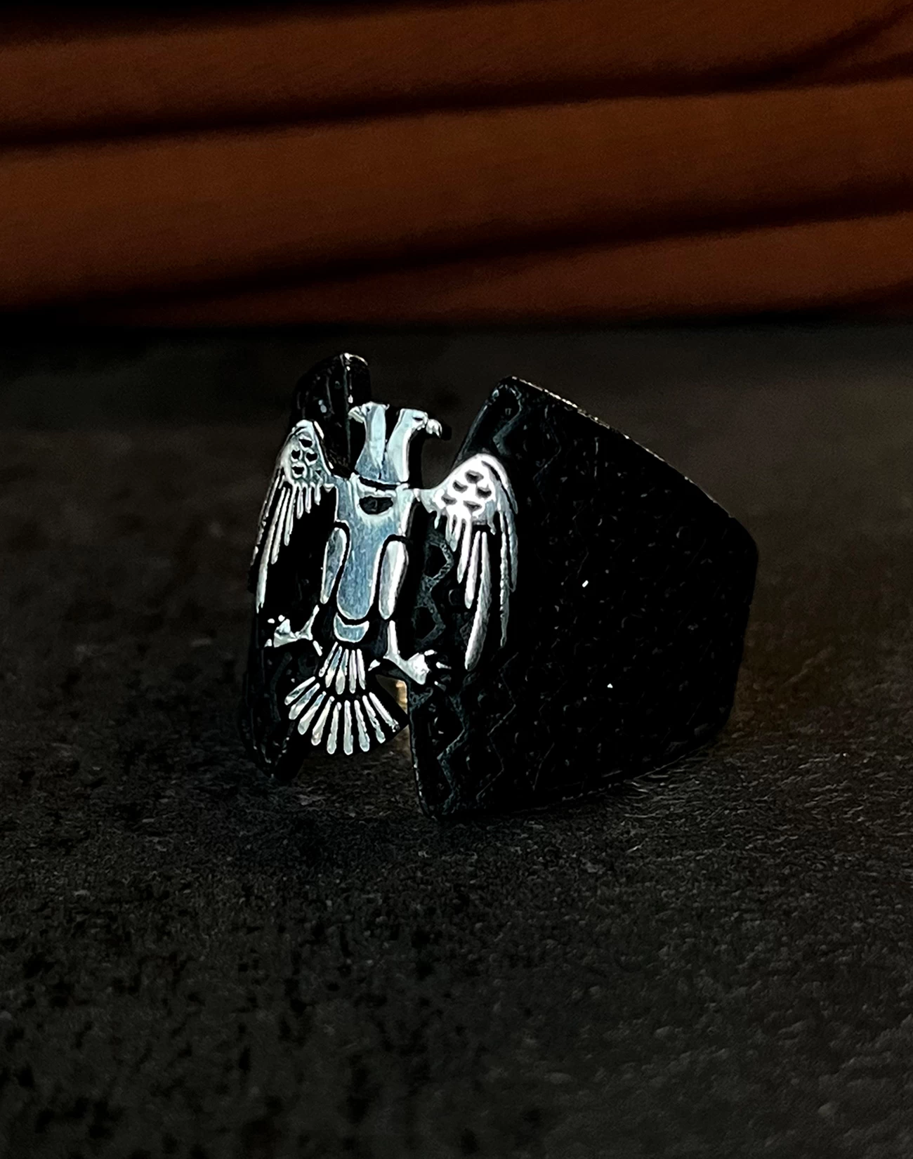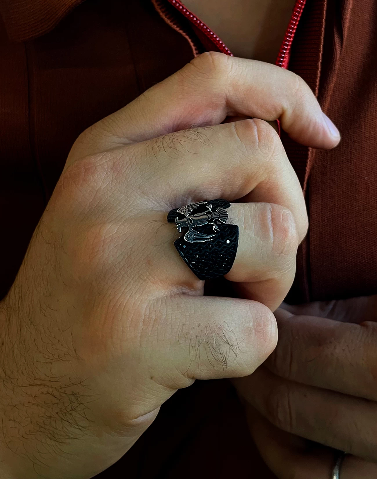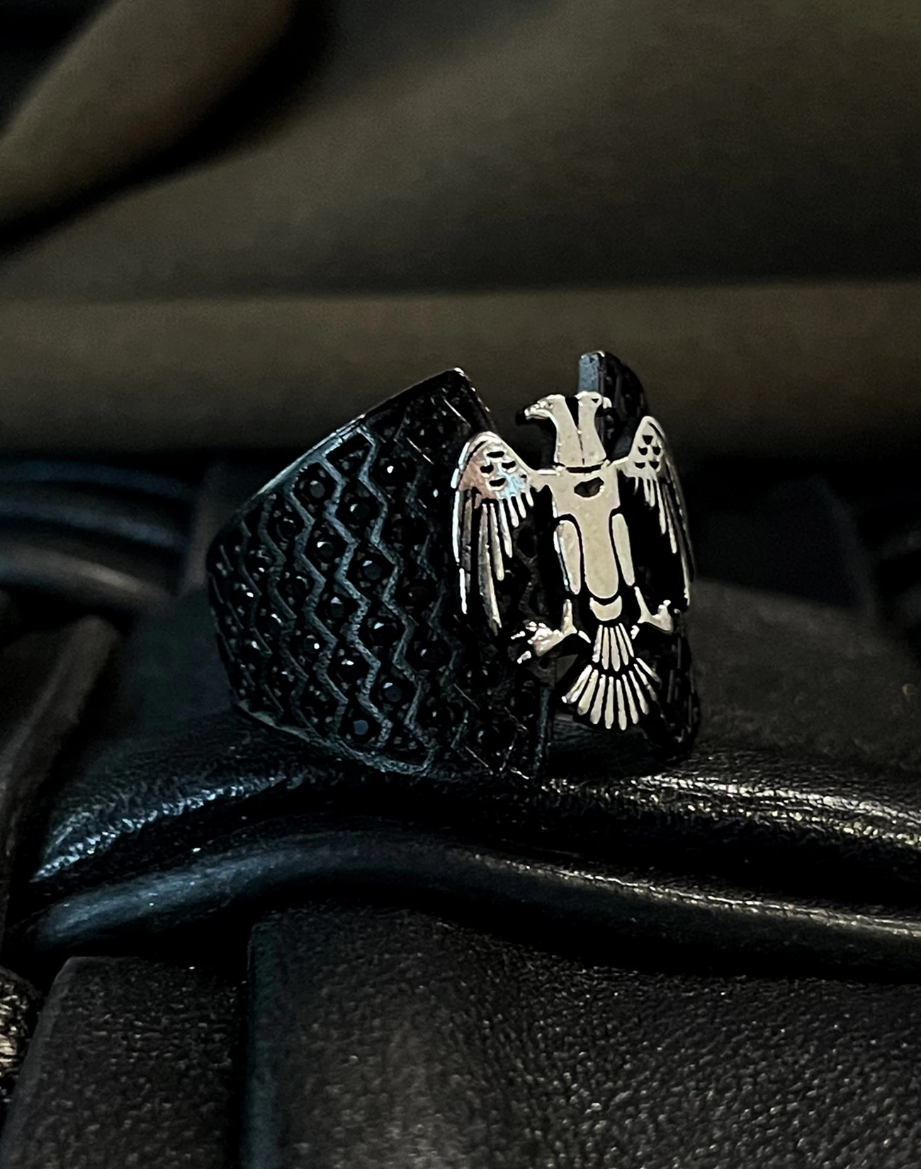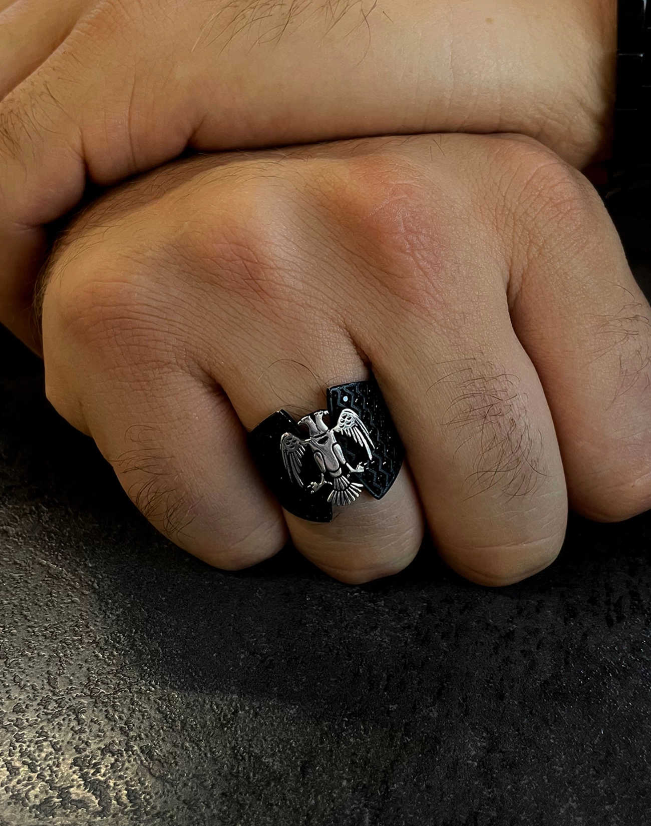 Çift başlı kartalın iki yöne bakan bakışları, hem geçmişi hem geleceği temsil eder. Bu anlam, yüzüğe yalnızca görsel bir çekicilik değil, derin bir sembolik değer kazandırır. Kartalın kanatlarında işlenen detaylar, ustalığın ve emeğin izlerini taşırken, siyah zemin üzerindeki kontrastlı gümüş figür, güçlü bir görsel etki oluşturur. Sert hatlarıyla net bir duruş sergilerken, ince işçiliğiyle sofistike bir şıklık sunar.