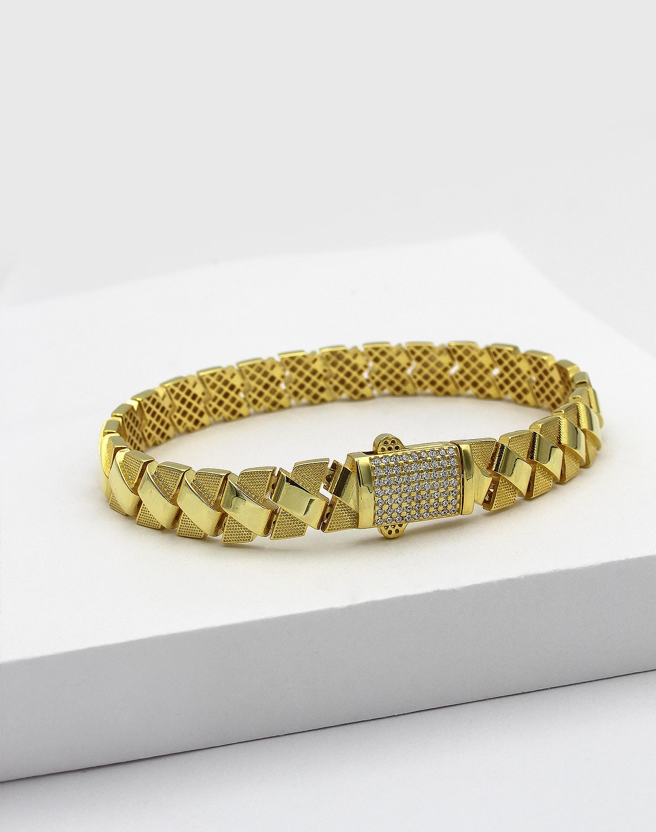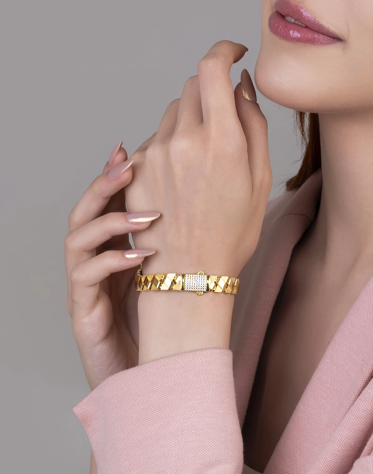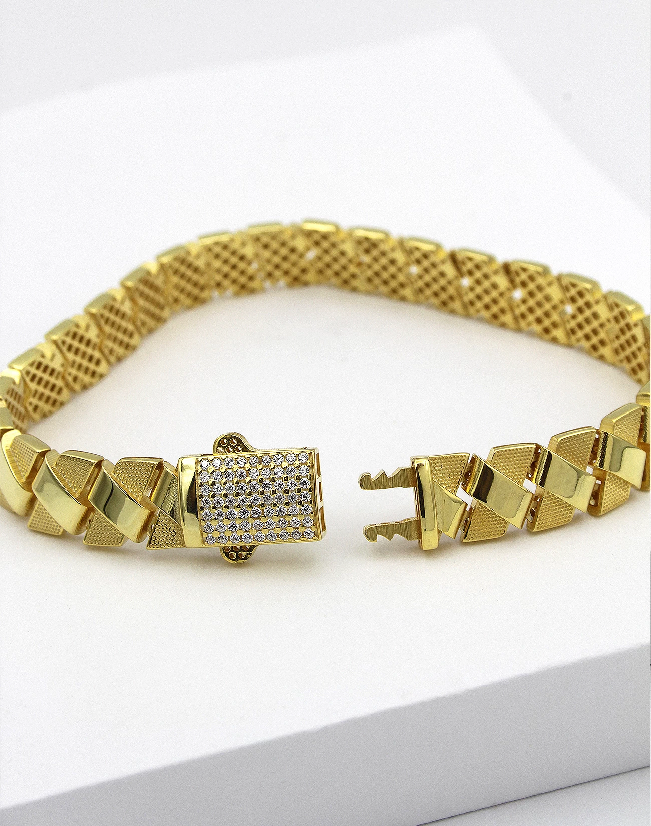 Zarafeti ve sofistike tasarımı ile göz dolduran bu özel bileklik, yüksek kaliteli 14 ayar altın kaplama ile işlenmiştir, parlaklığını uzun süre korur. Göz alıcı zirkon taşlar ise bilekliğe ekstra bir ışıltı ve lüks bir dokunuş katar