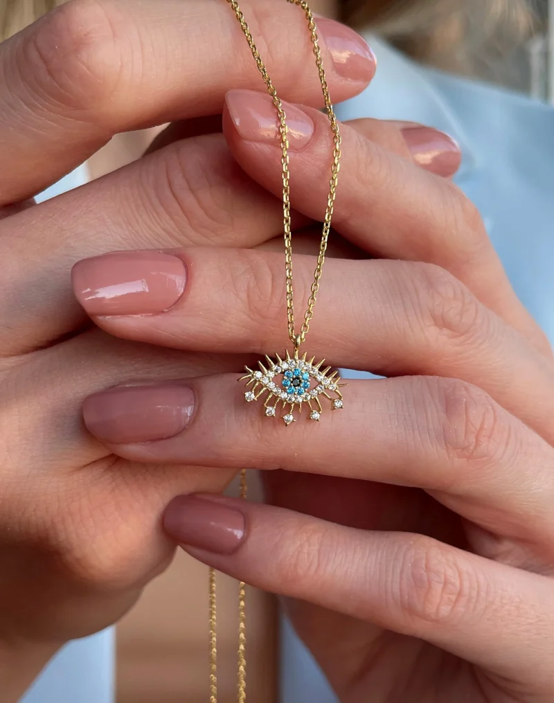 Kolye tasarımının merkezinde yer alan göz figürü, geçmişten günümüze kadar kötülüklerden korunmayı ve sezgisel gücü simgeler. Bu figürün içine yerleştirilen firuze taşı ise tasarıma hem estetik hem de anlam derinliği katar. Firuze taşı, huzur, pozitif enerji ve ruhsal dengeyi temsil eder. Canlı rengiyle dikkat çeken taş, ışığı yumuşak bir şekilde yansıtarak kolyeye doğal bir ışıltı kazandırır.