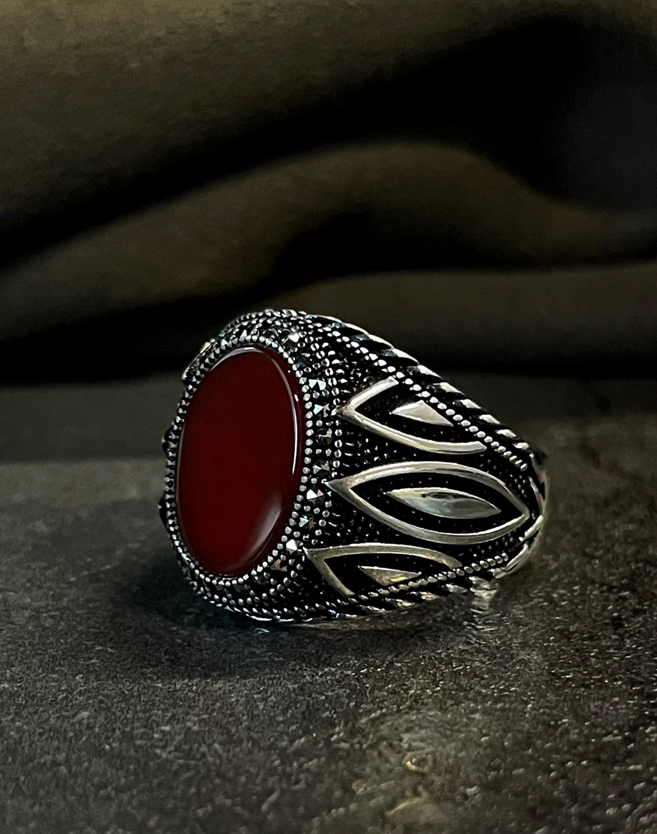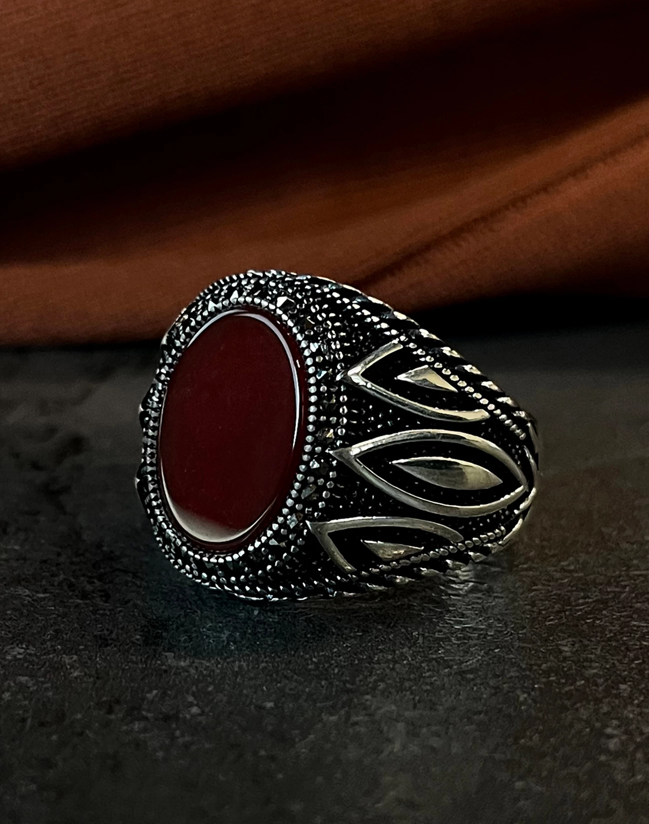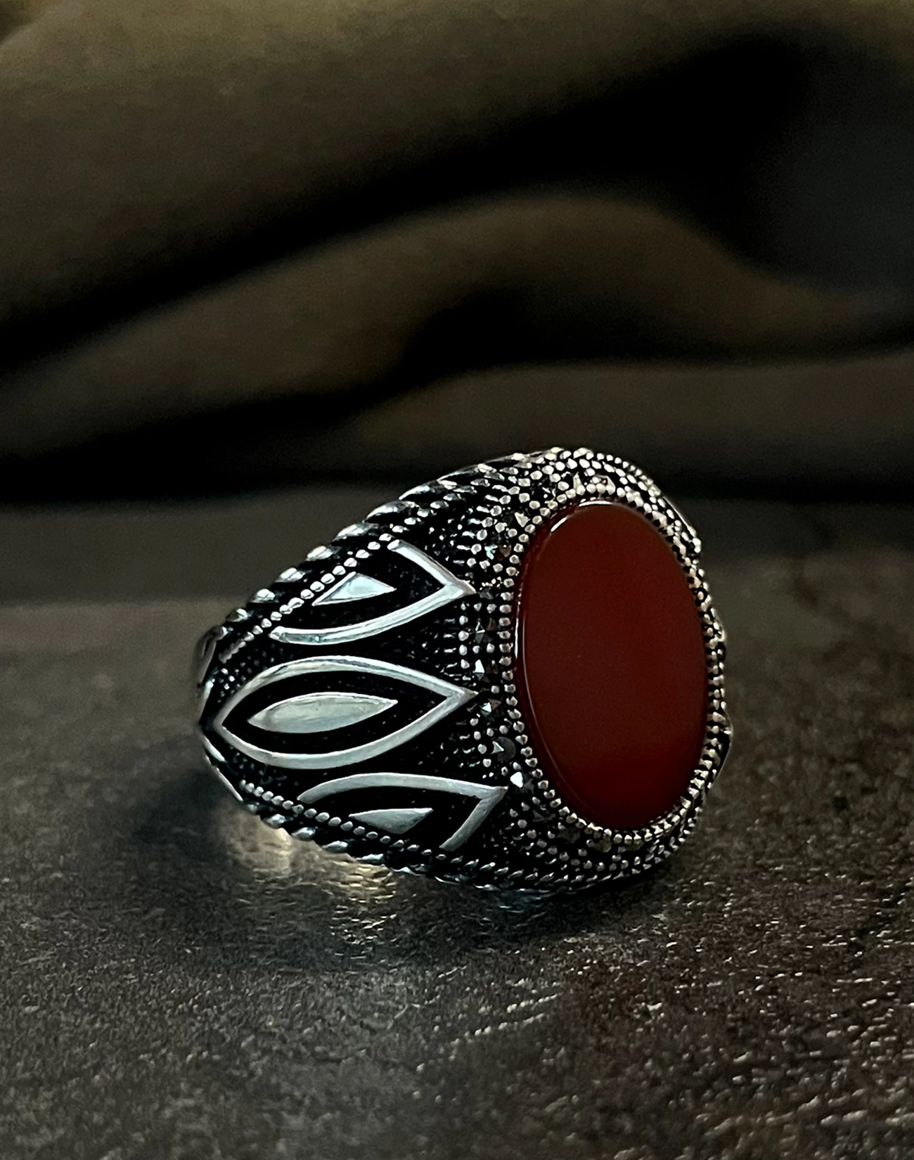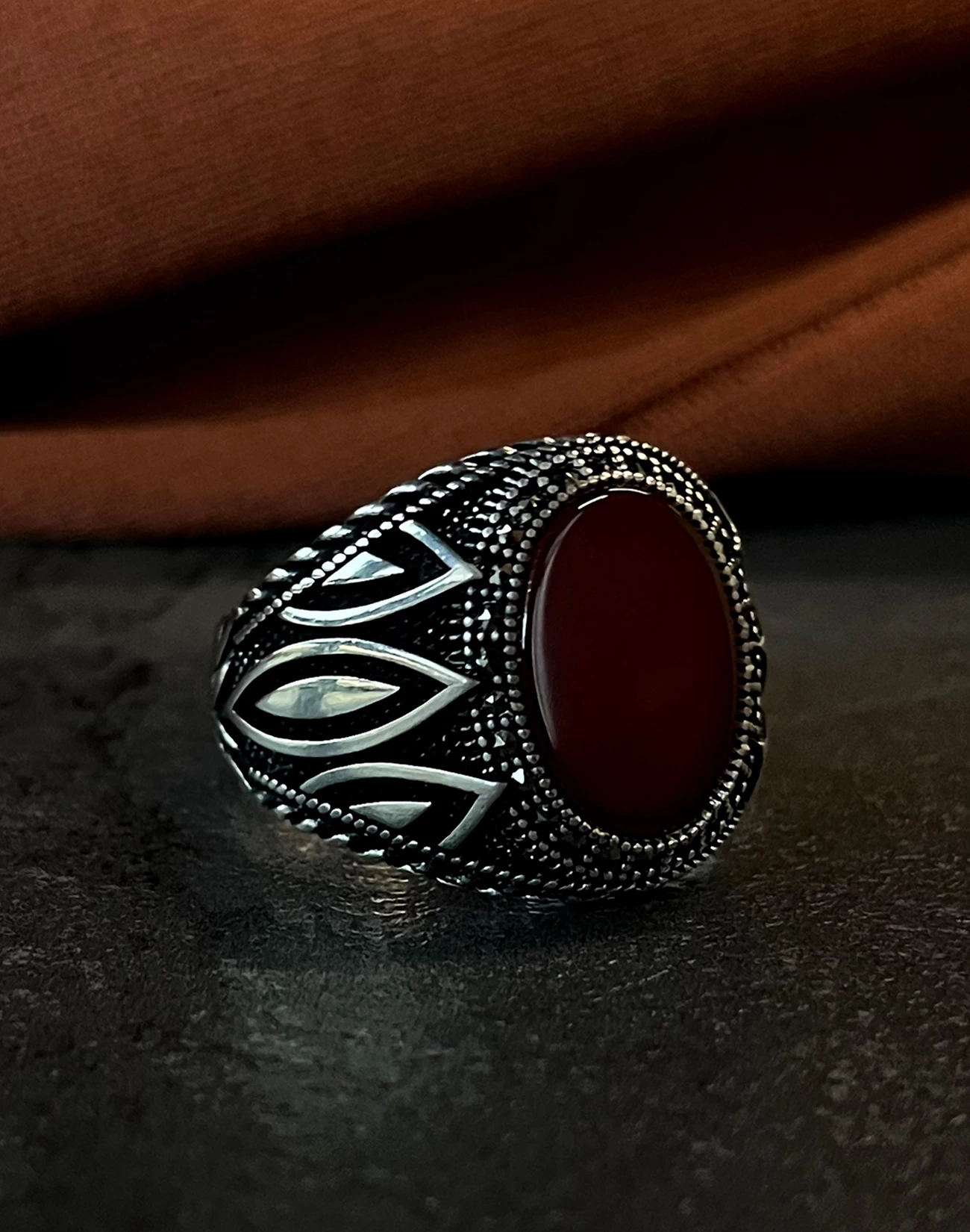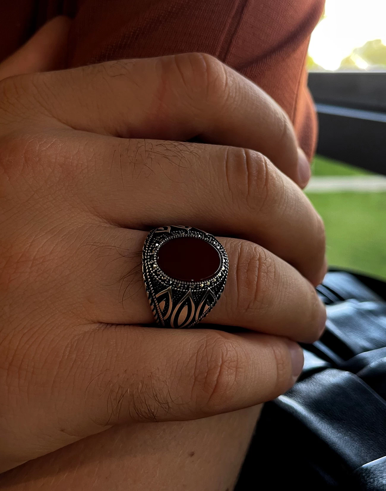 Günlük kullanımda güçlü bir imza parça olarak tercih edilebilen bu tasarım, klasik takımlardan spor-şık kombinlere kadar her tarza anında adapte olur. Akik taşının sıcak tonu ve keskin hatları sayesinde modanın geçici akımlarından etkilenmez; kalıcı, köklü ve güven veren bir şıklık anlayışını temsil eder. Her ortamda ağırlığını hissettiren bu yüzük, kalabalıklar içinde sıradanlaşmak istemeyen, duruşunu net çizgilerle ortaya koyan erkekler için tasarlanmıştır.