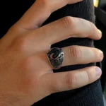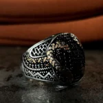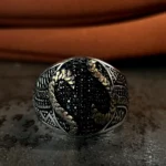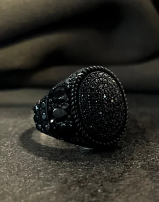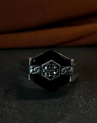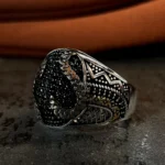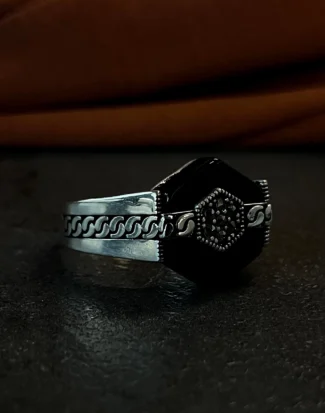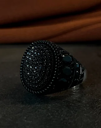 Tasarımda kullanılan ve adeta bir labirenti andıran karmaşık desenler; yaşamın çok katmanlı yapısını, tecrübeyi ve bu karmaşanın içindeki sarsılmaz iradeyi simgelerken aynı zamanda modern sanatın özgür formlarından ilham alan bir estetik sunar. Parlak gümüşün ışıltısı ile siyah mikro taşların yarattığı karanlık doku arasındaki dengeli birleşim, tasaraıma maskülen bir enerji kazandırır. Bu yüzük, sadece görsel bir aksesuar değil, aynı zamanda takan kişinin çok yönlü karakterini ve özgün stilini yansıtan sessiz bir imza öğesidir. Gösterişi karmaşanın içindeki rafinelikte hissettiren yapısıyla, güçlü ve özgüvenli bir ifade sunar.