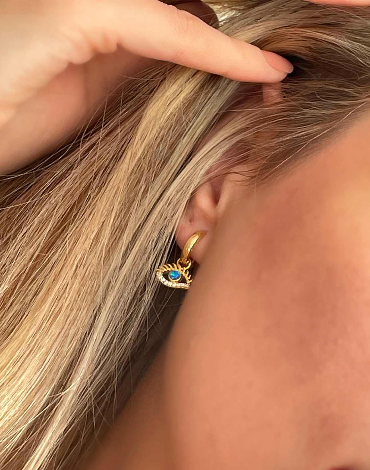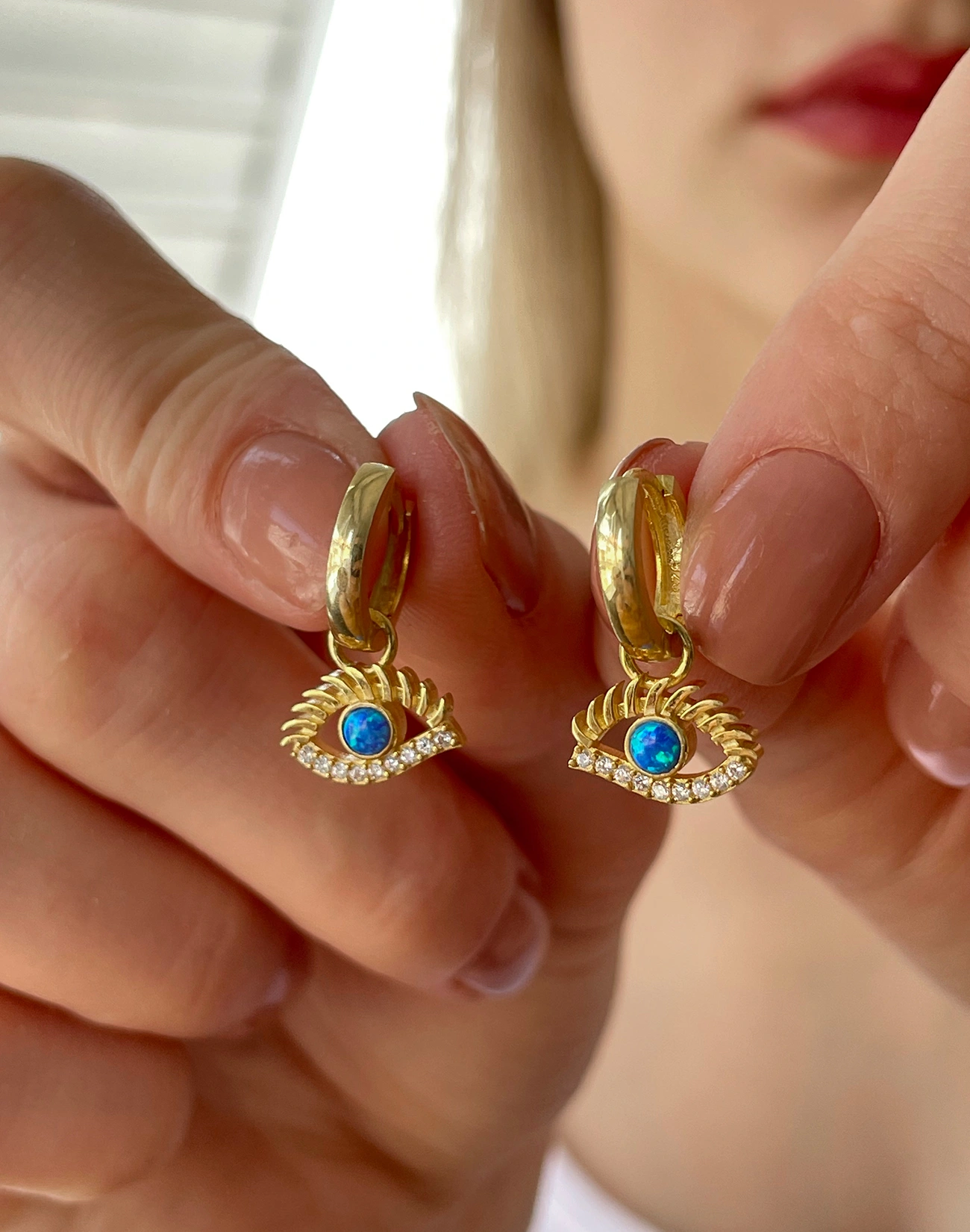 Küpede kullanılan mavi opal taşı, ışığı yumuşak ve büyüleyici bir şekilde yansıtarak tasarıma derinlik katar. Opal taşı, içsel huzuru, yaratıcılığı ve sezgileri simgeleyen değerli taşlardan biridir. Bu küpede taşın zarif renk geçişleri, sade bir tasarımı sofistike bir şıklığa dönüştürüyor. Tasarımın merkezinde yer alan göz figürü ise hem koruyucu anlamı hem de sembolik estetiği ile modern takı severlere hitap ediyor.