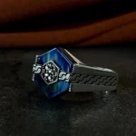 Modern çizgilerle şekillenen bu özel tasarım, klasik erkek takısı anlayışına çağdaş bir yorum kazandırıyor. 925 ayar gümüşten üretilen Modern Motifli Gümüş Erkek Yüzüğü BERIA , net hatları ve dengeli formuyla güçlü bir duruş sergilerken, detaylarında gizlenen zarafetle sofistike bir şıklık sunar. Tasarımın kalbinde yer alan derin mavi tonlu yüzey, çevresini saran modern motiflerle birleşerek etkileyici bir görsel derinlik oluşturur.