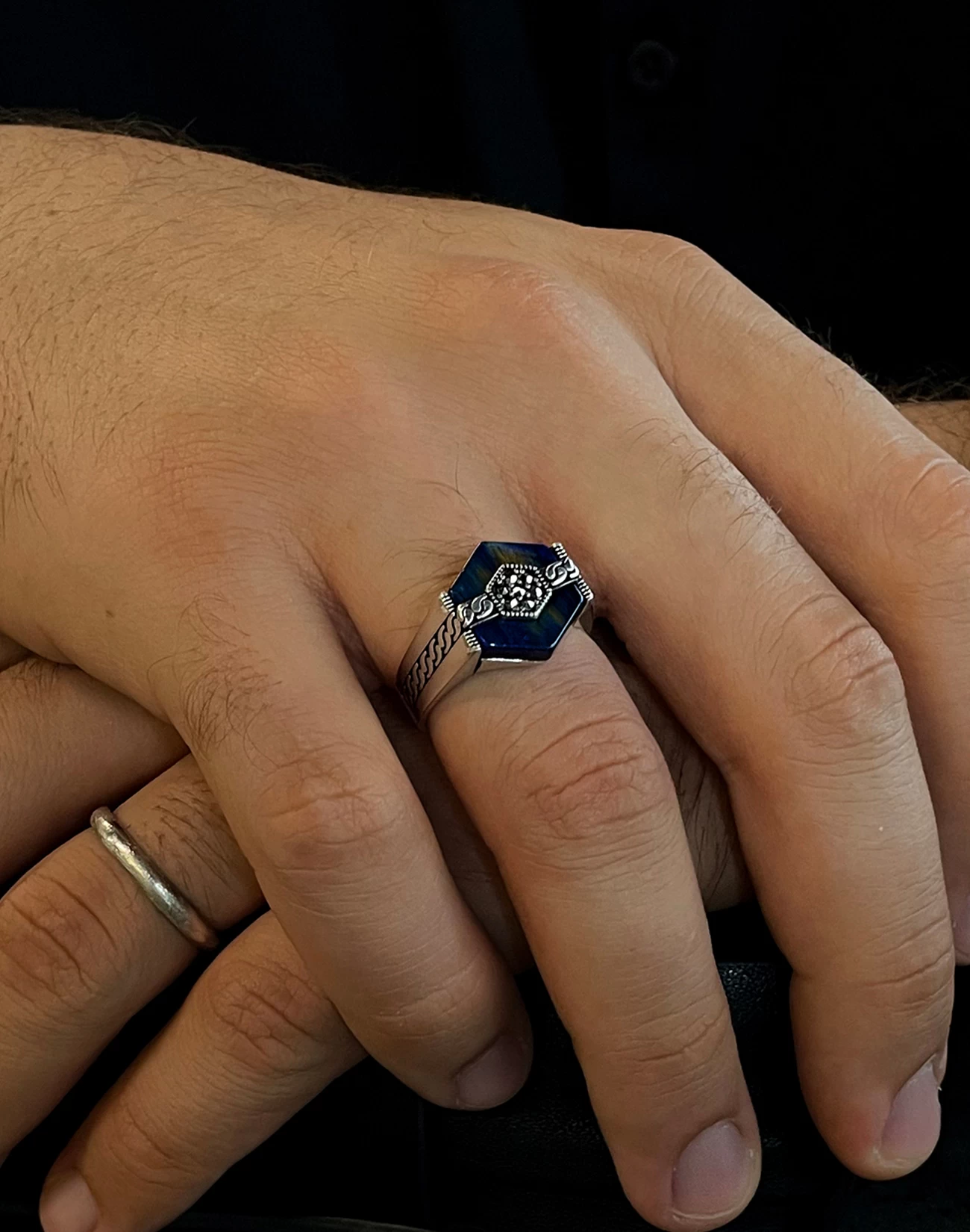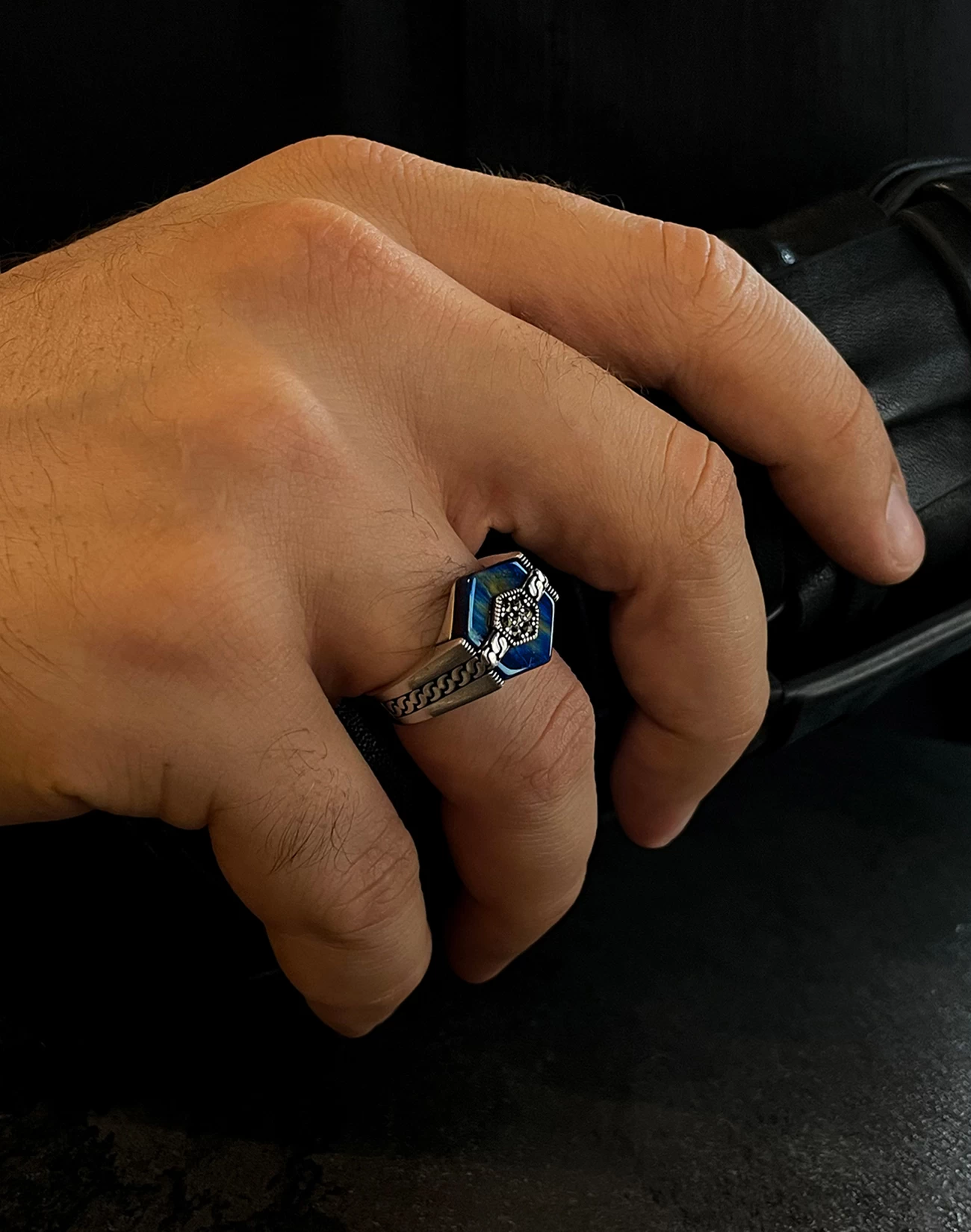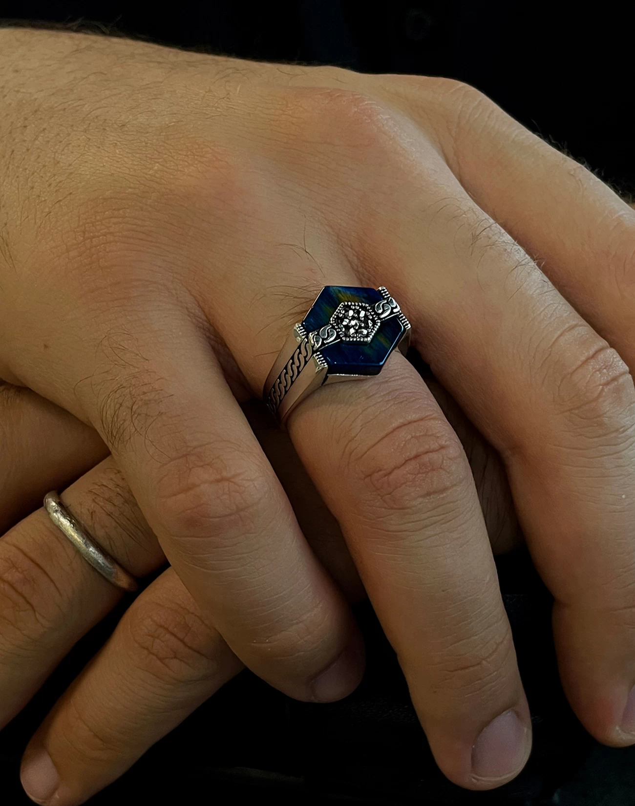 Modern çizgilerle şekillenen bu özel tasarım, klasik erkek takısı anlayışına çağdaş bir yorum kazandırıyor. 925 ayar gümüşten üretilen Modern Motifli Gümüş Erkek Yüzüğü BERIA , net hatları ve dengeli formuyla güçlü bir duruş sergilerken, detaylarında gizlenen zarafetle sofistike bir şıklık sunar. Tasarımın kalbinde yer alan derin mavi tonlu yüzey, çevresini saran modern motiflerle birleşerek etkileyici bir görsel derinlik oluşturur.