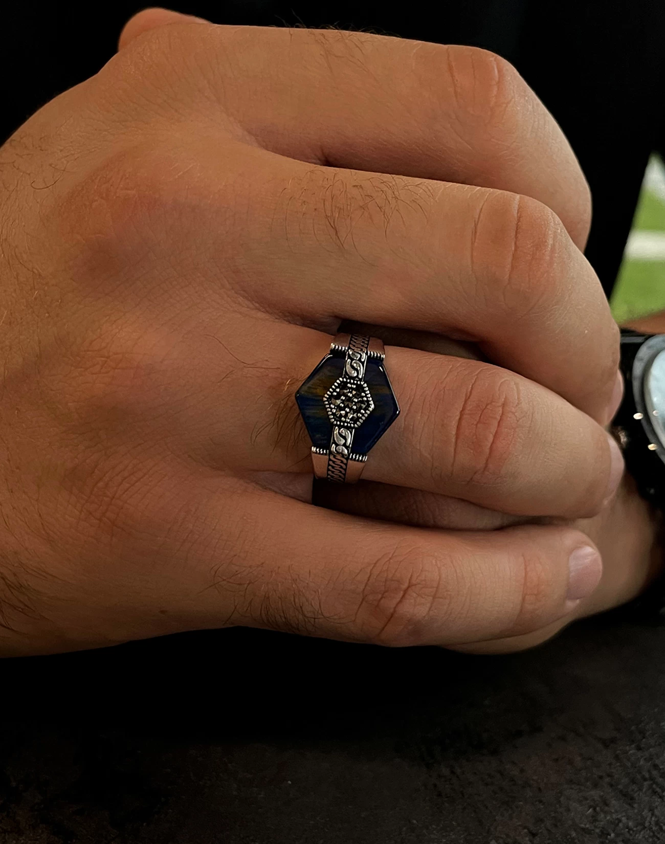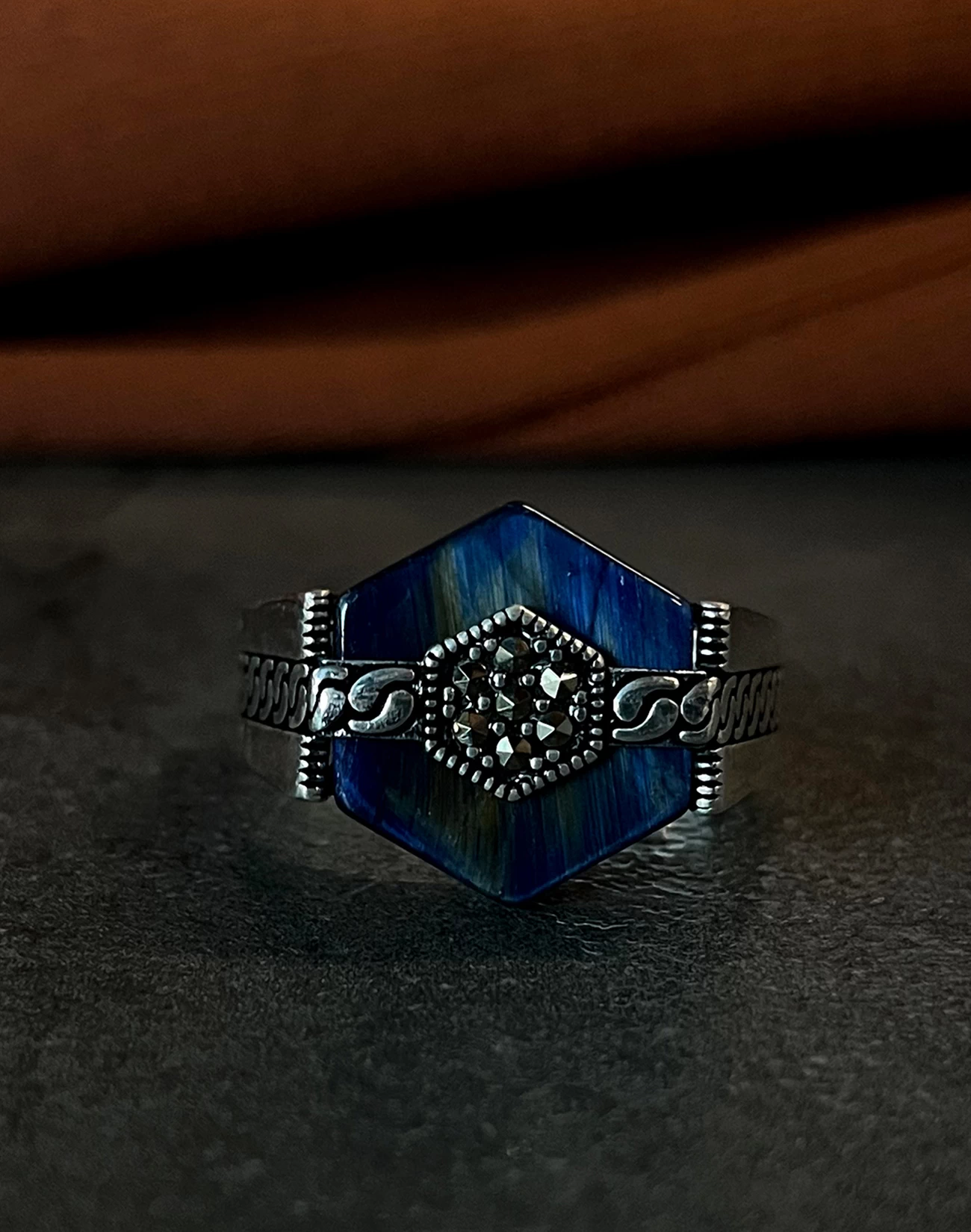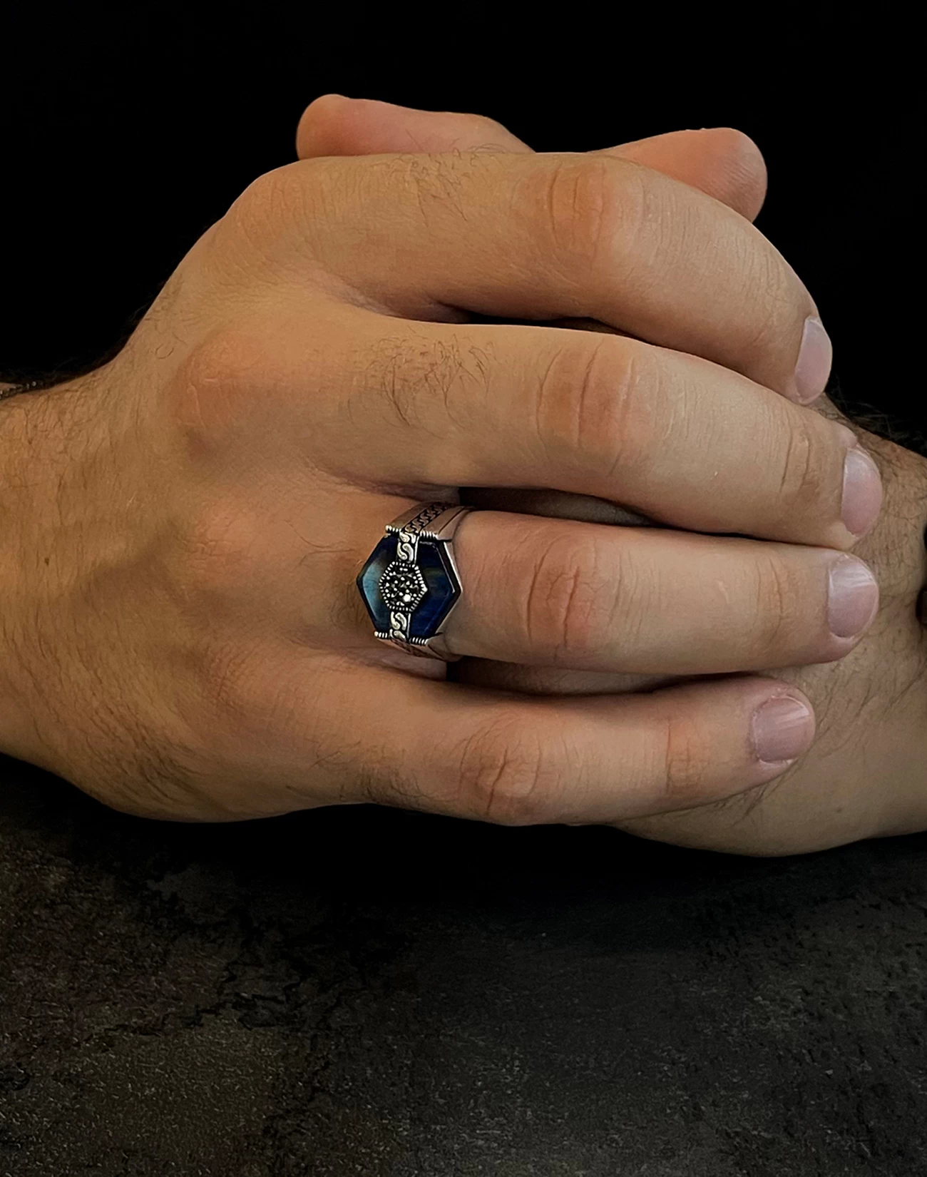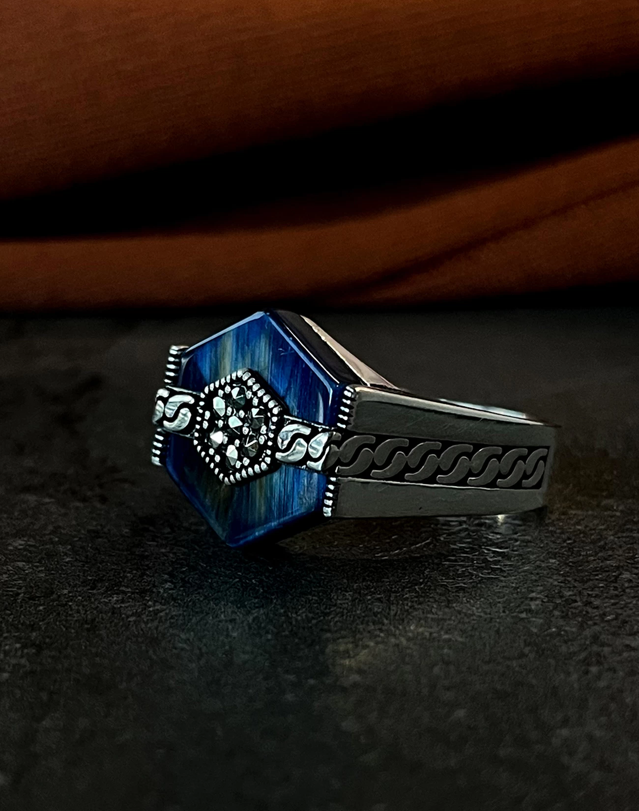 Modern çizgilerle şekillenen bu özel tasarım, klasik erkek takısı anlayışına çağdaş bir yorum kazandırıyor. 925 ayar gümüşten üretilen Modern Motifli Gümüş Erkek Yüzüğü BERIA , net hatları ve dengeli formuyla güçlü bir duruş sergilerken, detaylarında gizlenen zarafetle sofistike bir şıklık sunar. Tasarımın kalbinde yer alan derin mavi tonlu yüzey, çevresini saran modern motiflerle birleşerek etkileyici bir görsel derinlik oluşturur.