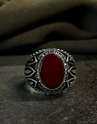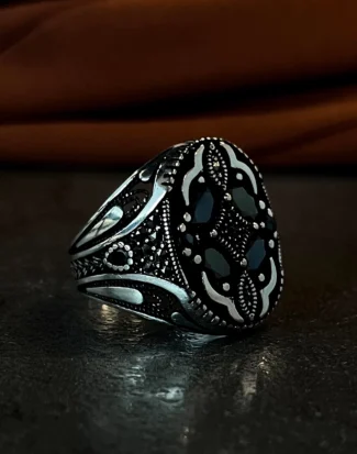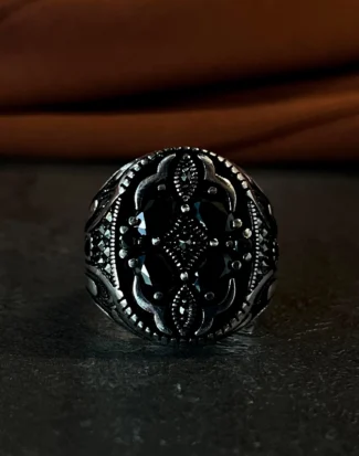 Tasarımda kullanılan ve gücü simgeleyen geometrik motifler, sürekliliği ve sarsılmaz bir iradeyi temsil ederken aynı zamanda modern mimariden ilham alan köşeli bir estetik sunar. Parlak gümüşün doğal asaleti ile karanlık tonların yarattığı kontrast, tasarıma maskülen bir enerji ve hükmeden bir karakter kazandırır. Bu yüzük, sadece görsel bir aksesuar değil, aynı zamanda takan kişinin karizmasını ve sahip olduğu sarsılmaz “otorite”yi yansıtan sessiz bir stil öğesidir. Gösterişten uzak ama iddiasını her ortamda hissettiren yapısıyla, güçlü ama sofistike bir ifade sunar.