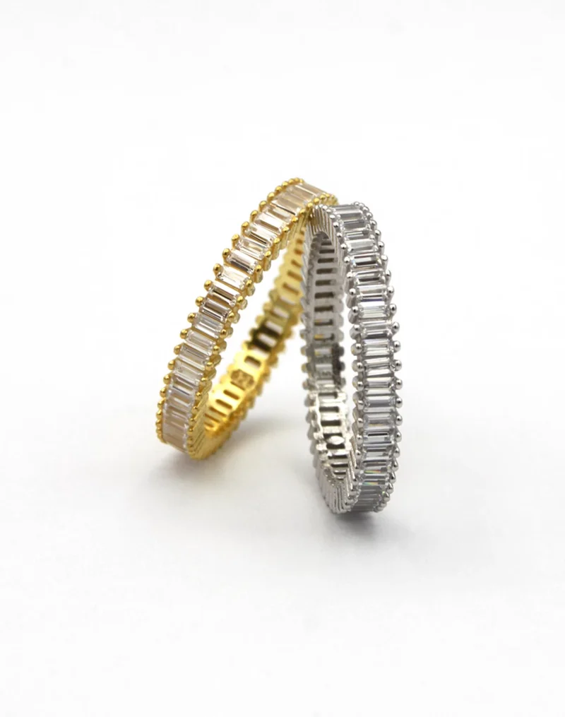 Zarafetin ve lüksün simgesi olan Pırlanta Dizayn Baget Tam Tur Yüzük, göz alıcı baget kesimli zirkon taşları ile 925 ayar gümüşten üretilmiştir. Bu muhteşem yüzük, altın kaplama ve rodyum kaplama seçenekleriyle sizin için tasarlanmıştır.