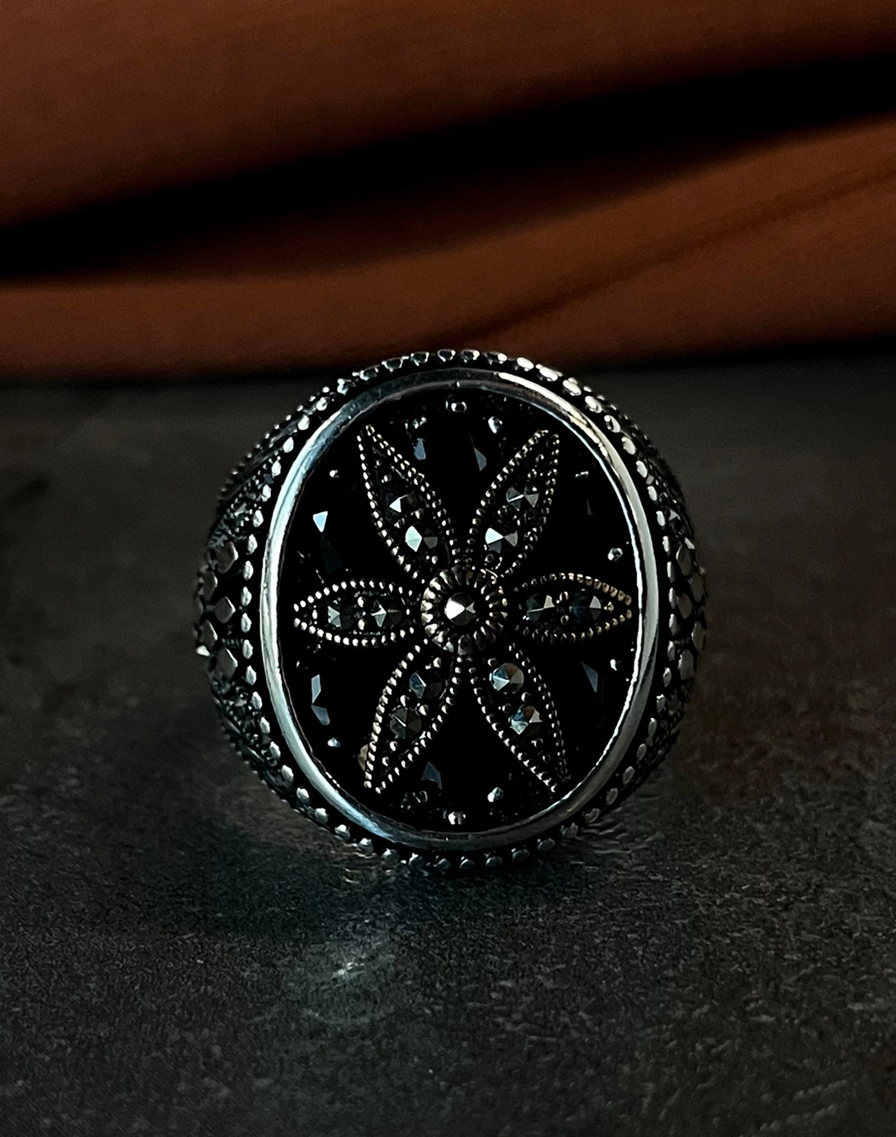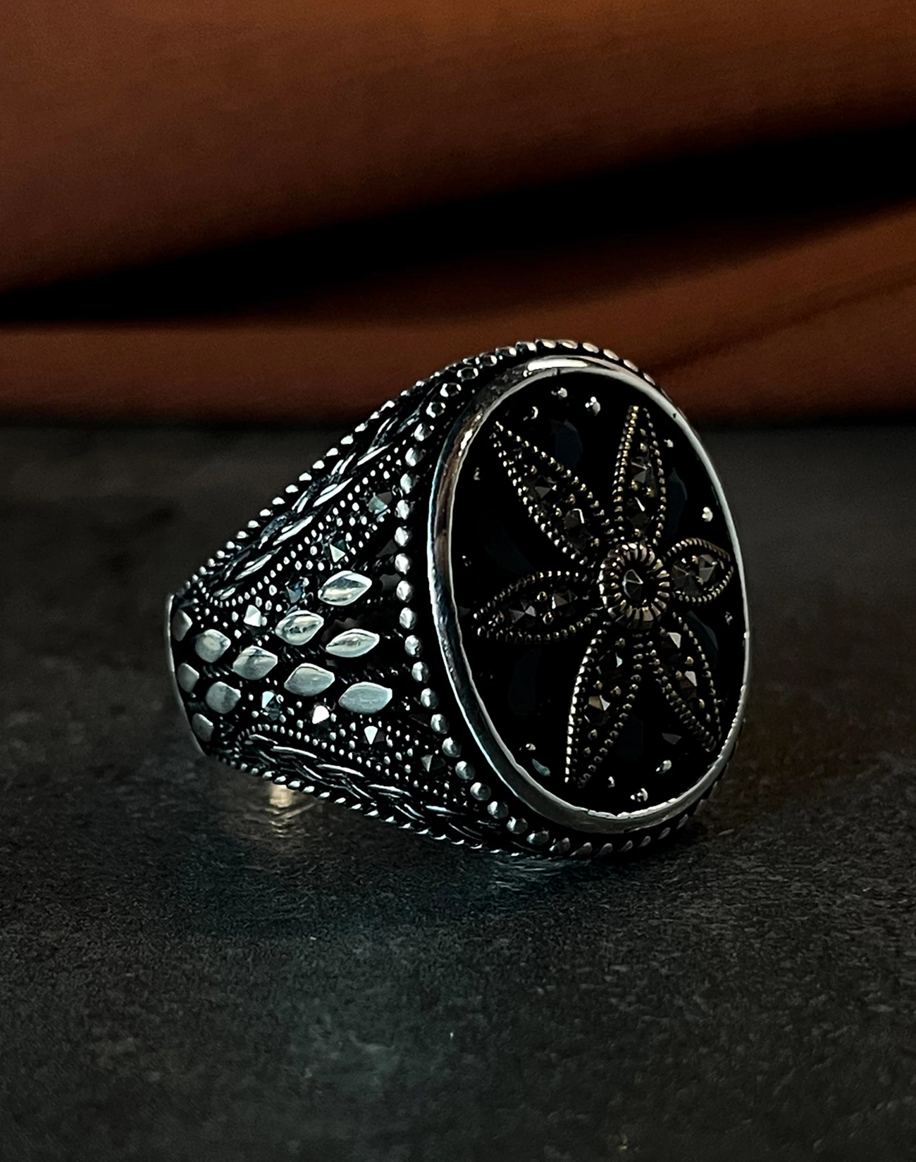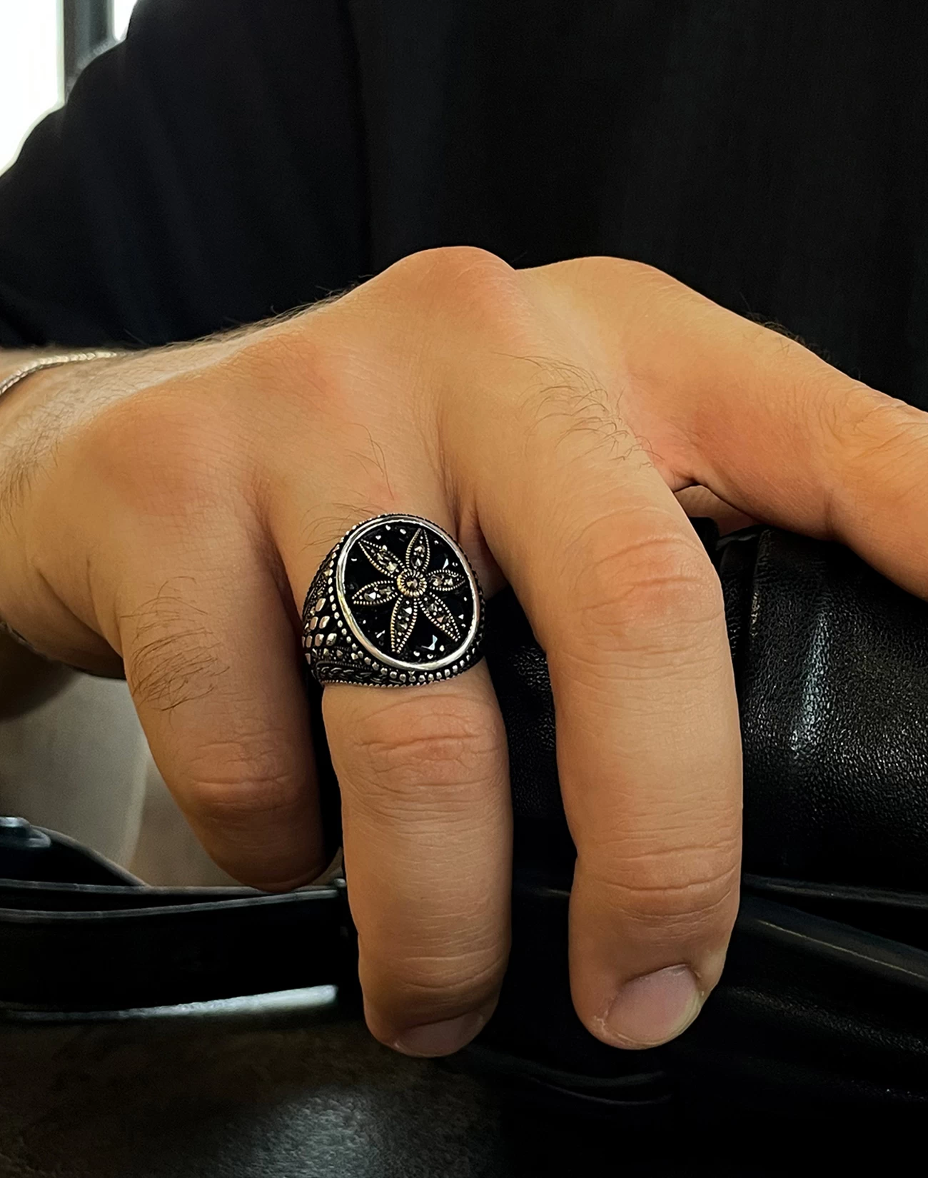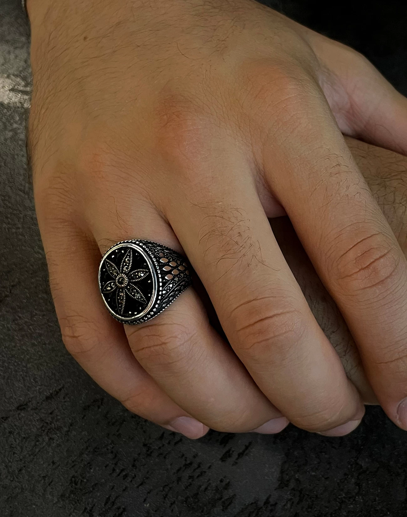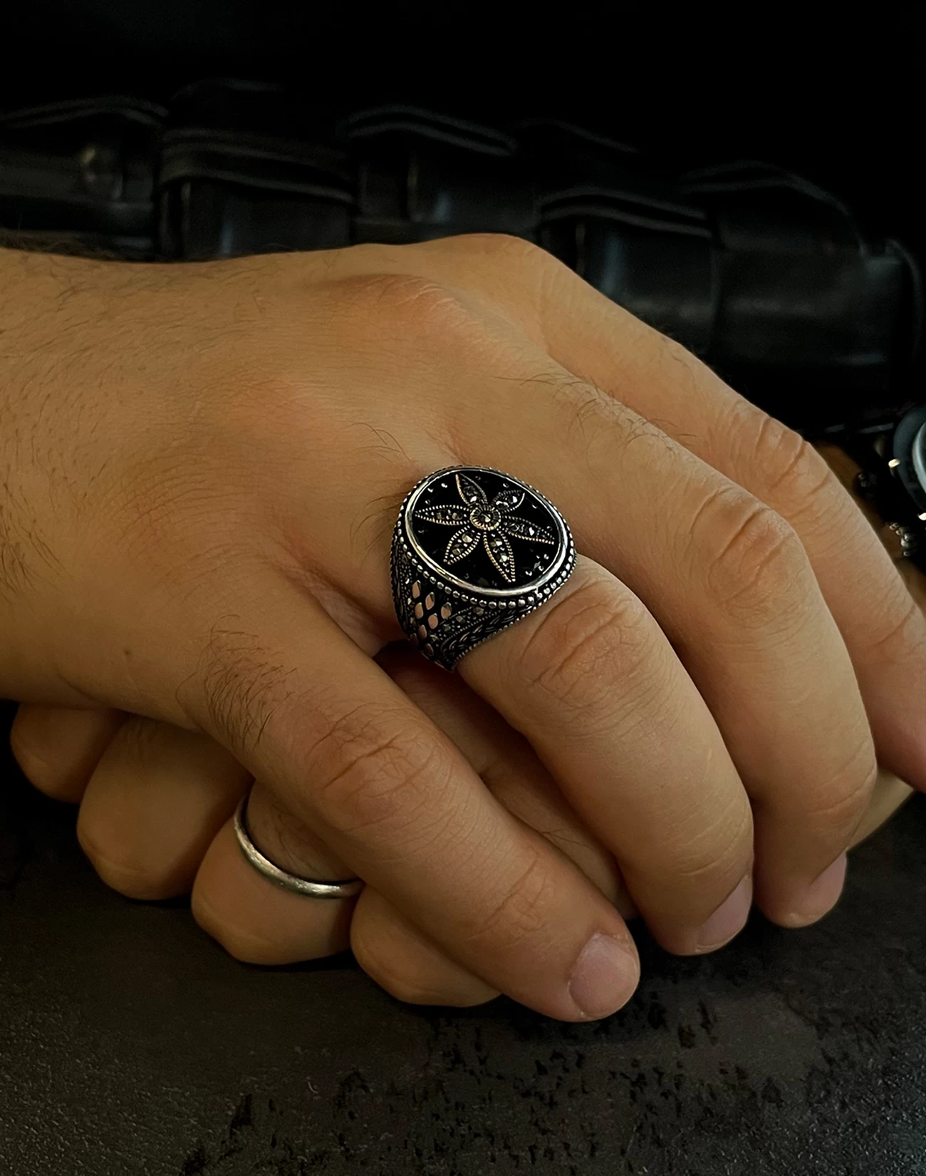 Tasarımda kullanılan ve birbirine kenetlenmiş formları anımsatan motifler, sadakati, güveni ve yaşam boyu süren sarsılmaz bağlılığı simgelerken aynı zamanda modern mimariden ilham alan bir estetik sunar. Parlak gümüşün doğal ışıltısı ile koyu tonlu yüzeyin yarattığı kontrast, tasarıma maskülen bir enerji kazandırır. Bu yüzük, sadece görsel bir aksesuar değil, aynı zamanda takan kişinin değerlerini ve karakterini yansıtan sessiz bir stil öğesidir. Gösterişten uzak ama iddiasını her detayda hissettiren yapısıyla, güçlü ama rafine bir ifade sunar.