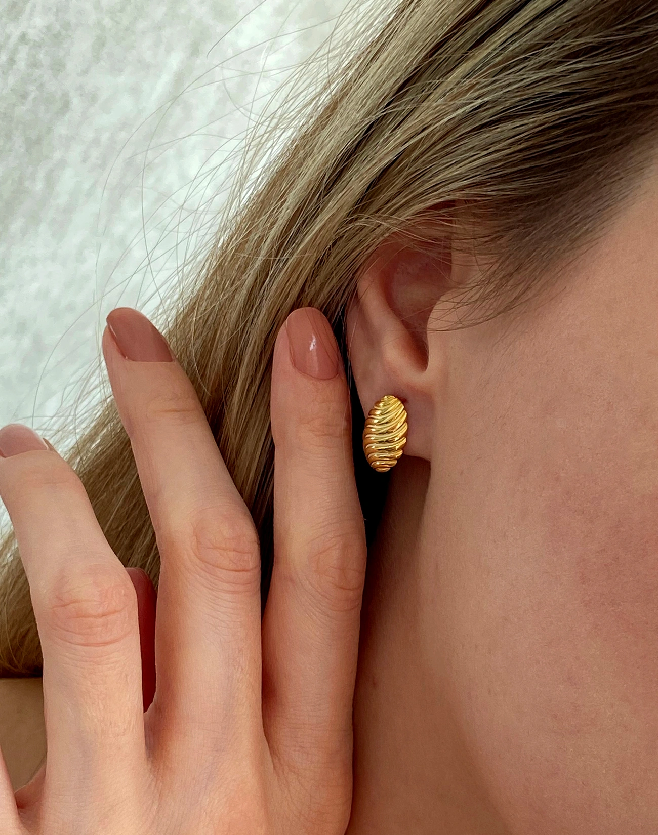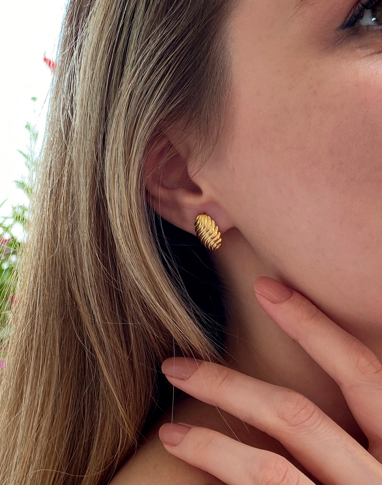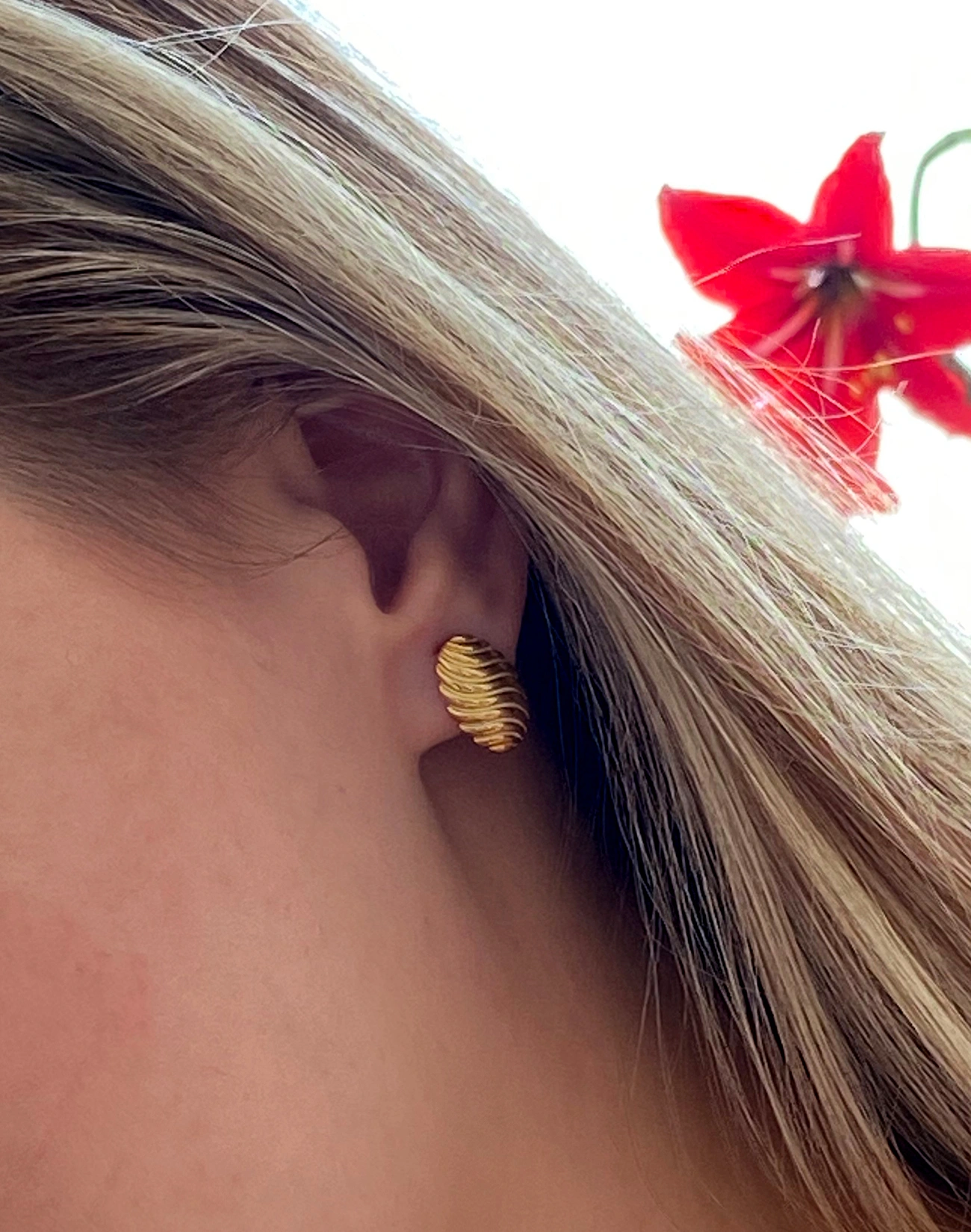 Tasarımın merkezinde yer alan sarmal şekil, hareketi ve dönüşümü simgelerken; küpeye estetik bir dinamizm kazandırır. Bu özgün form, kulağı zarifçe sararak sade ama iddialı bir görünüm oluşturur. Düz hatlardan sıkılan, farklı ama abartısız bir şıklık arayanlar için bu tasarım ideal bir alternatif sunar. Çivili yapısı ise kullanım kolaylığı sağlarken, kulakta sağlam bir duruş sergiler.