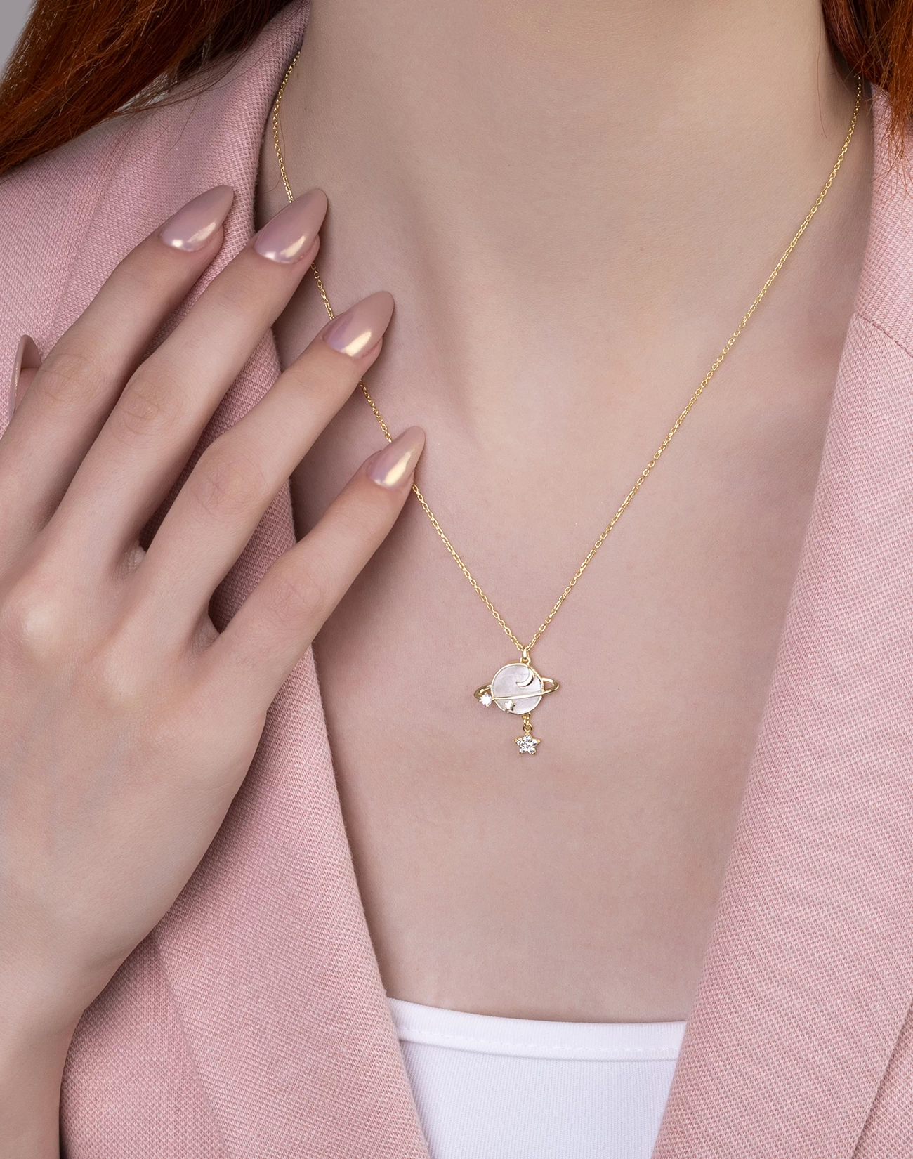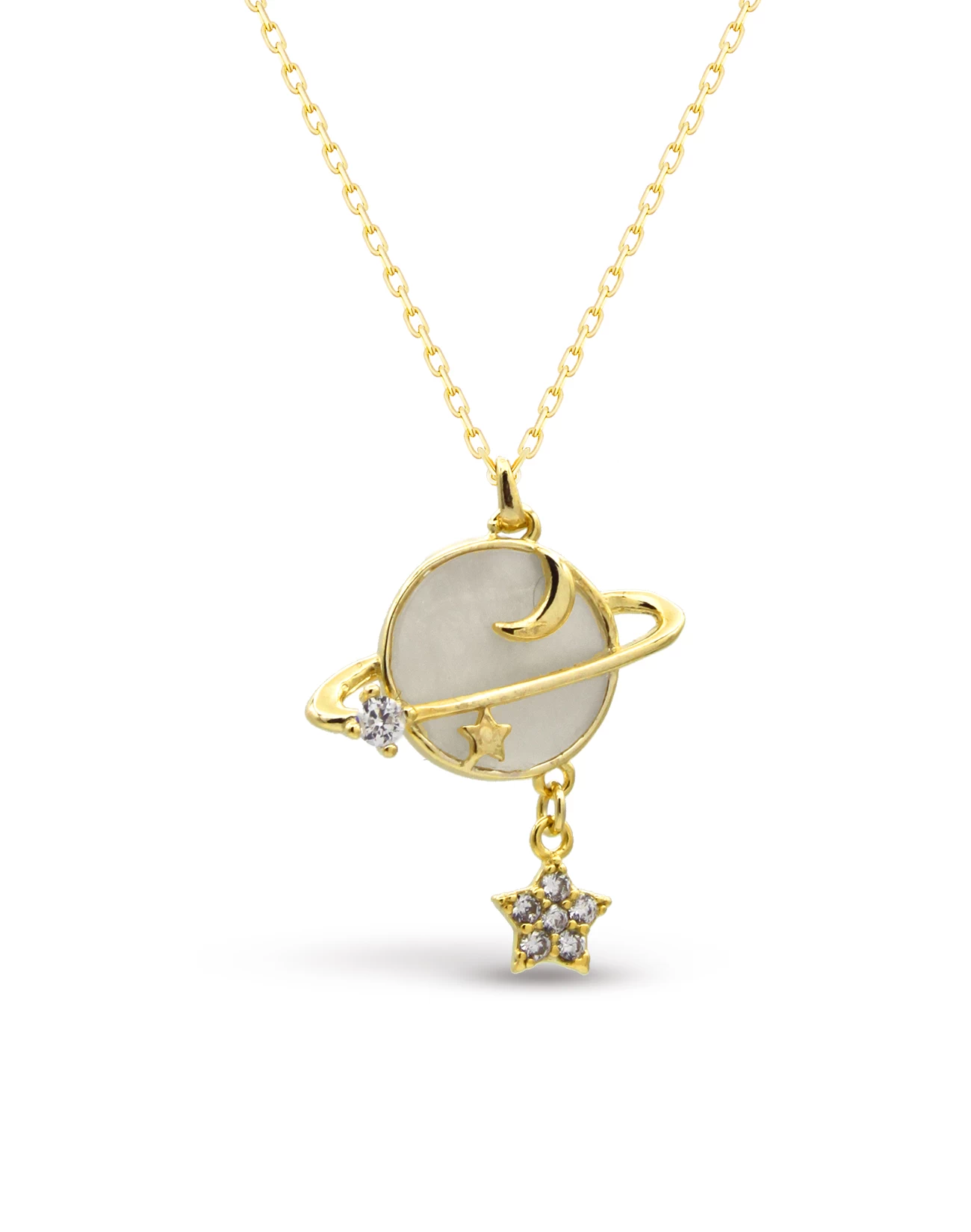 - Tasarım: Sedef taşı detaylı yıldız ve sallantılı gezegen motifi, kolyeye dinamik ve modern bir hava katıyor.