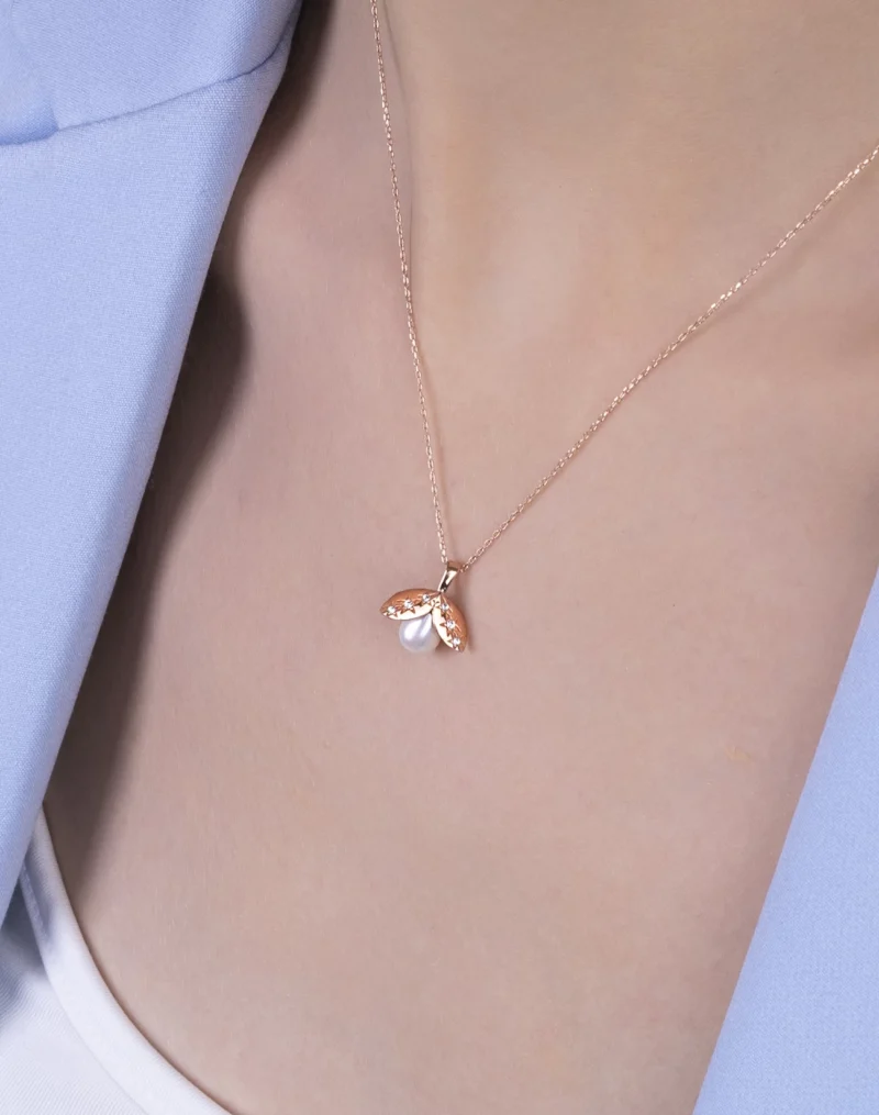 Tasarım Detayları: İnci detaylarla süslenmiş yıldız çiçeği motifi, bu kolyeyi hem modern hem de klasik bir görünüme kavuşturuyor.