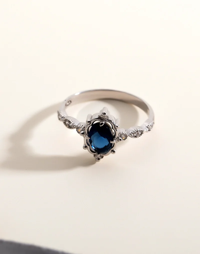 Yüzüğün merkezinde yer alan oval kesim safir taşı, derin mavi tonlarıyla göz kamaştırıcı bir etki yaratır. Safir taşı tarih boyunca bilgeliğin, sadakatin ve asaletin sembolü olarak kabul edilmiştir. Bu taşın zarif oval kesimi ise hem nostaljik bir hava katar hem de ışığı en ideal şekilde yansıtarak doğal bir ışıltı sunar. Taşın çevresine yerleştirilen ince işçilikli motifler ve klasik detaylar, yüzüğe sofistike bir görünüm kazandırır.
